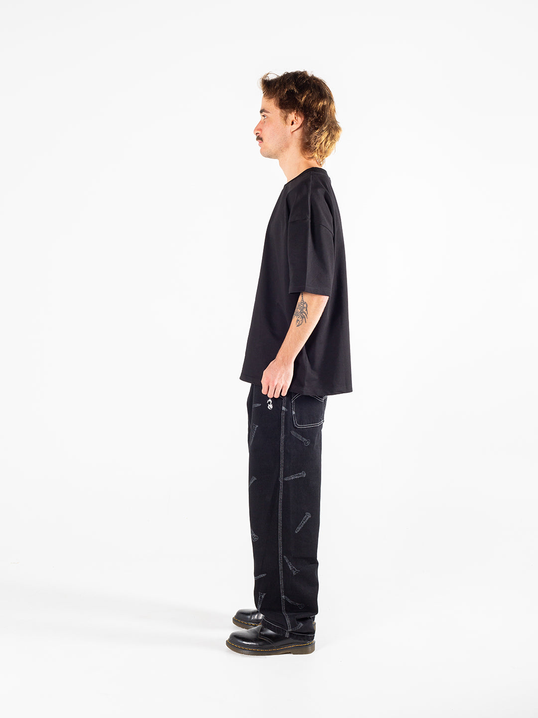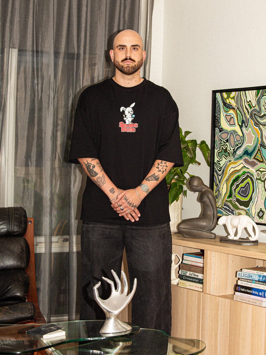 100% cotton heavyweight 270gsm short sleeve tee featuring heavy 2x1 ribbing on collar, boxy silhouette with dropped shoulder and plastisol ‘Bad Bunny’ screen printed graphic.