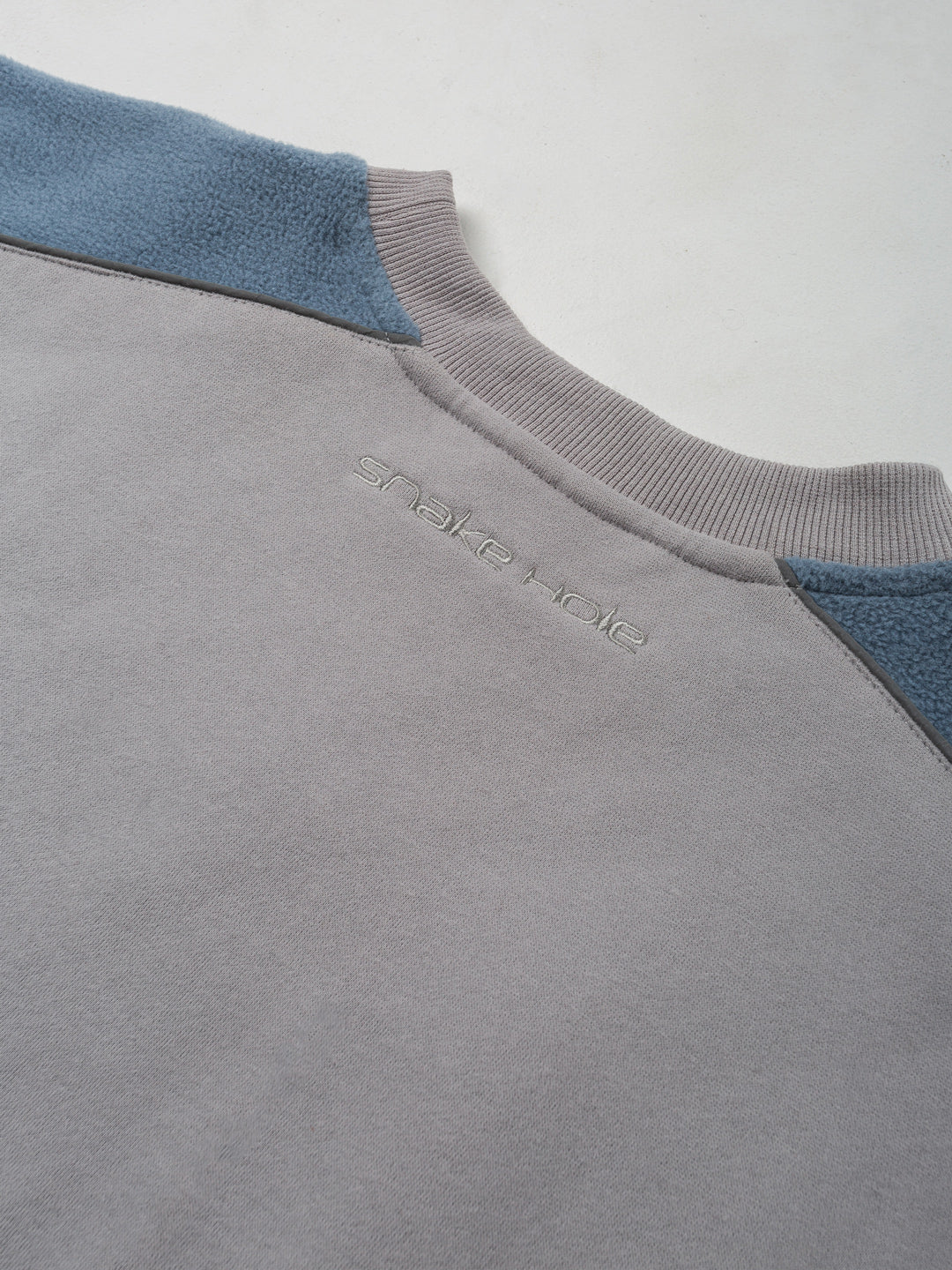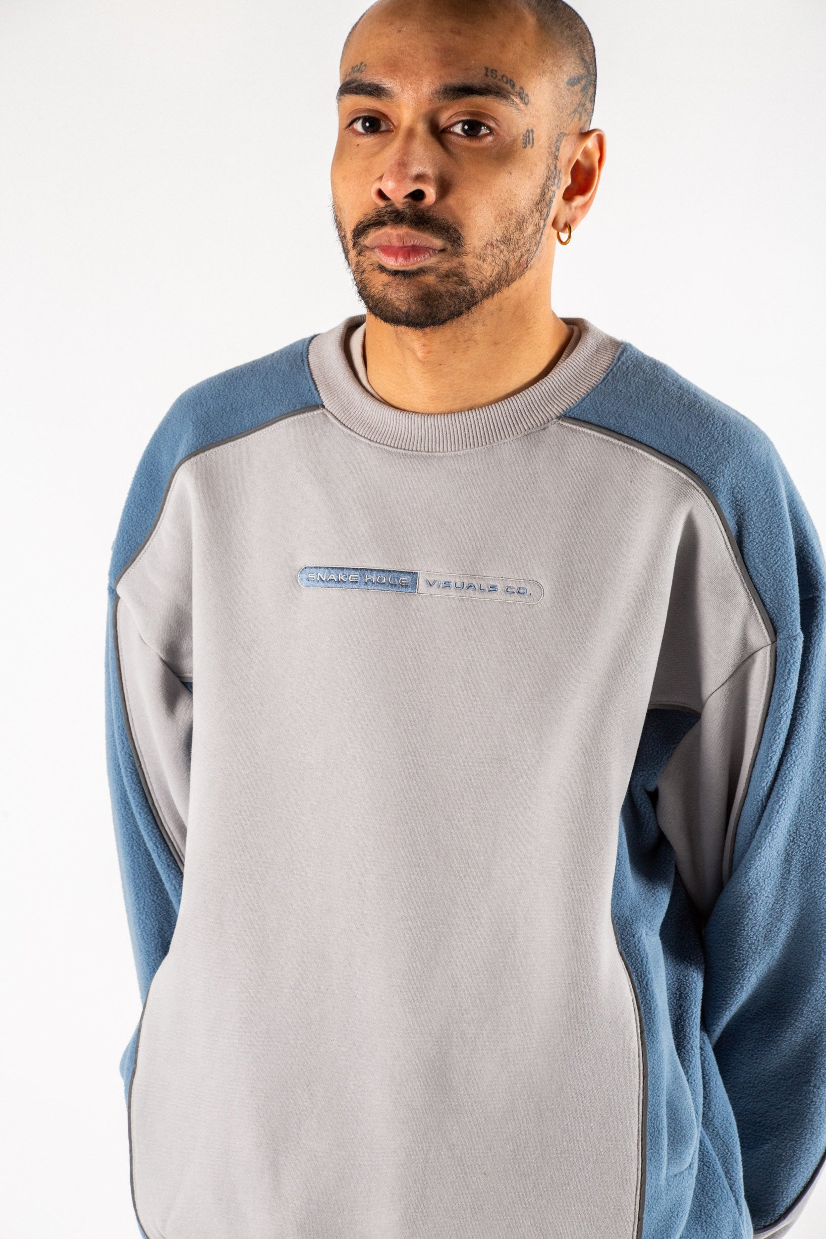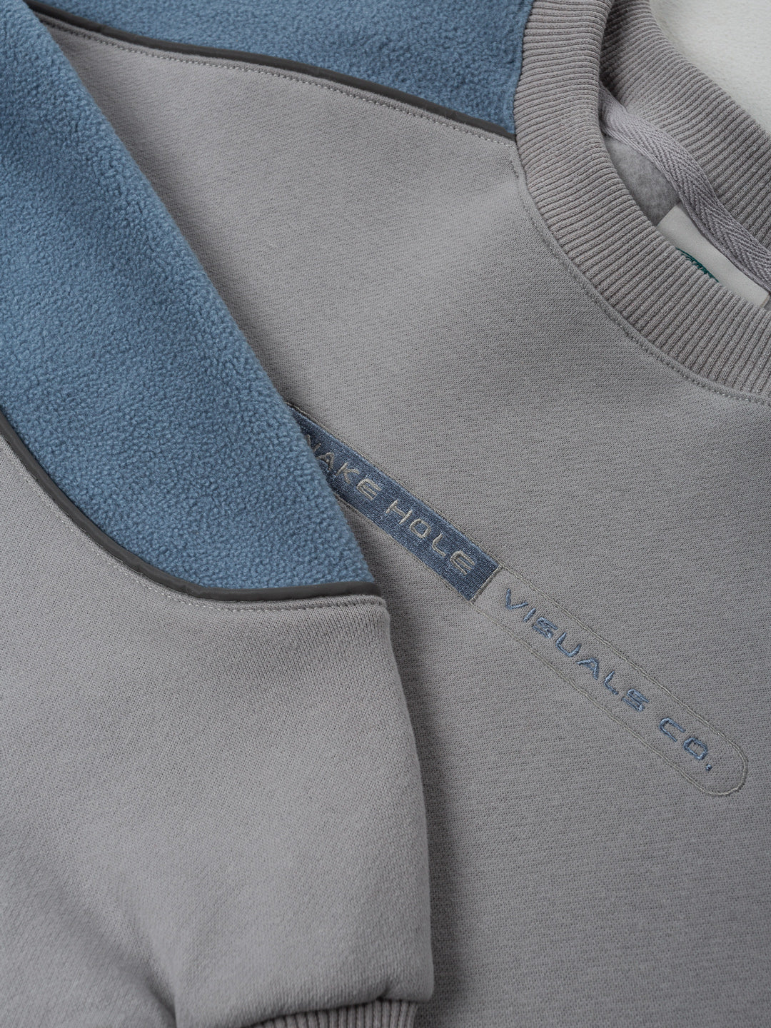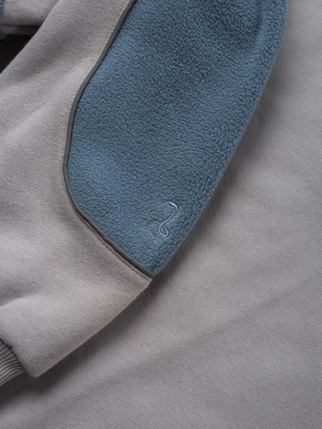 Heavyweight multi fabric fleece crew with exaggerated drop shoulder and chunky elastic 2x1 ribbing. Featuring unique two-colour panelling setup with contrast cotton and polar fleece fabric throughout. Pill logo embroidery on centre chest, finished with a plush, velvet-like hand-feel and branded embroidery on sleeve and back neck.