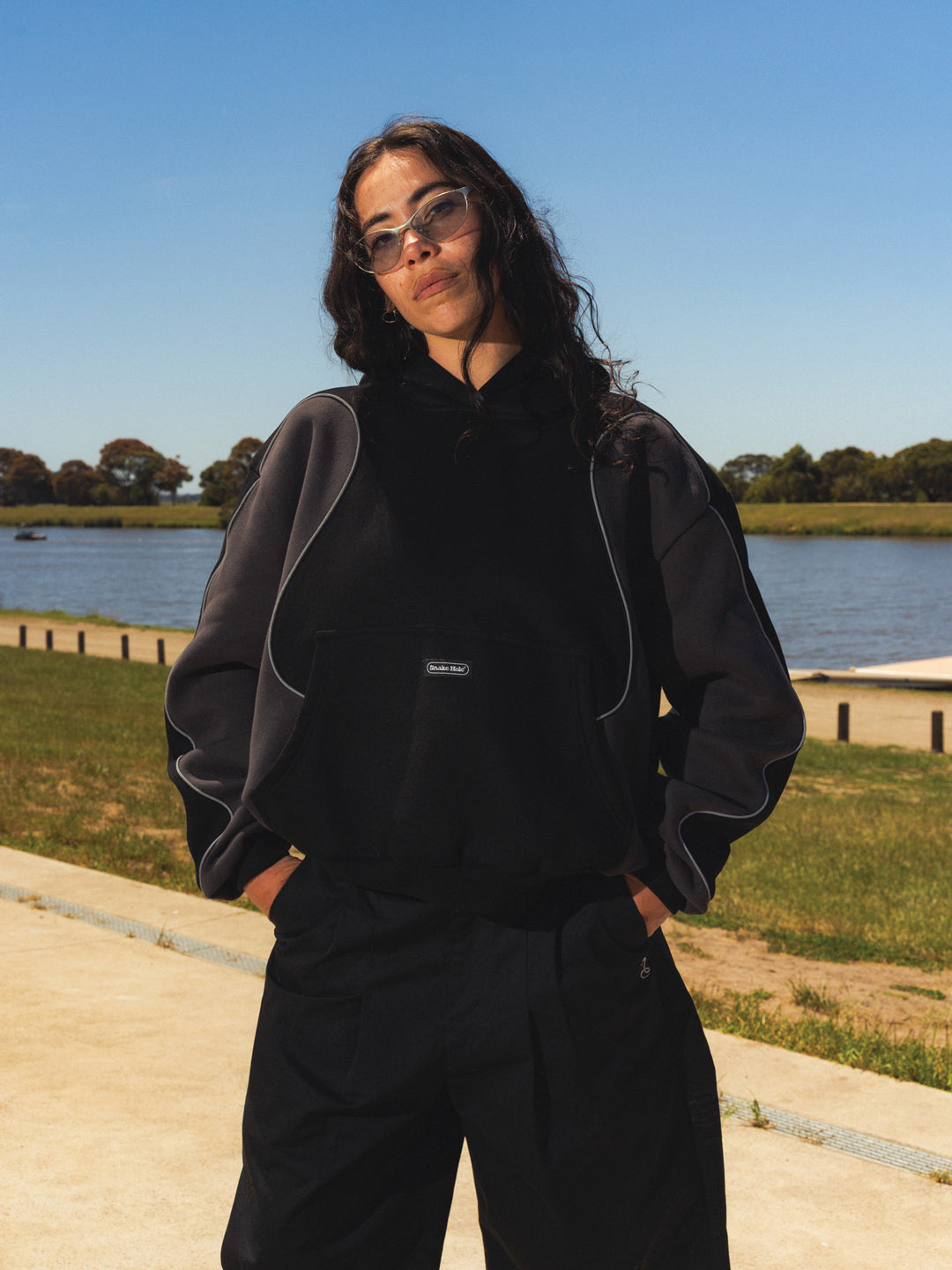 The 'Odyssey' hood is made from our plush 360gsm heavyweight brushed fleece, featuring our unique two colour panelling with contrast piping and branded woven label. This piece has 90's flavour, with an exaggerated dropped shoulder giving the sleeves a baggy fit. The body has a slightly cropped, boxy shape for a relaxed fit. Finished with our signature heavyweight 2x1 ribbing and large joey pocket on centre front.