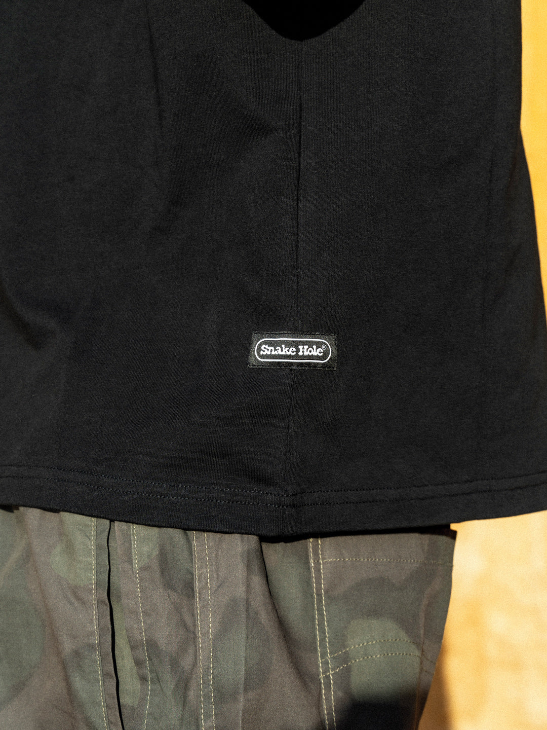 Mid-weight 230gsm 100% cotton tee featuring screen printed 'Outta Space' graphic on front, 2x1 neck ribbing and 'Snake Hole' embroidery on sleeve.