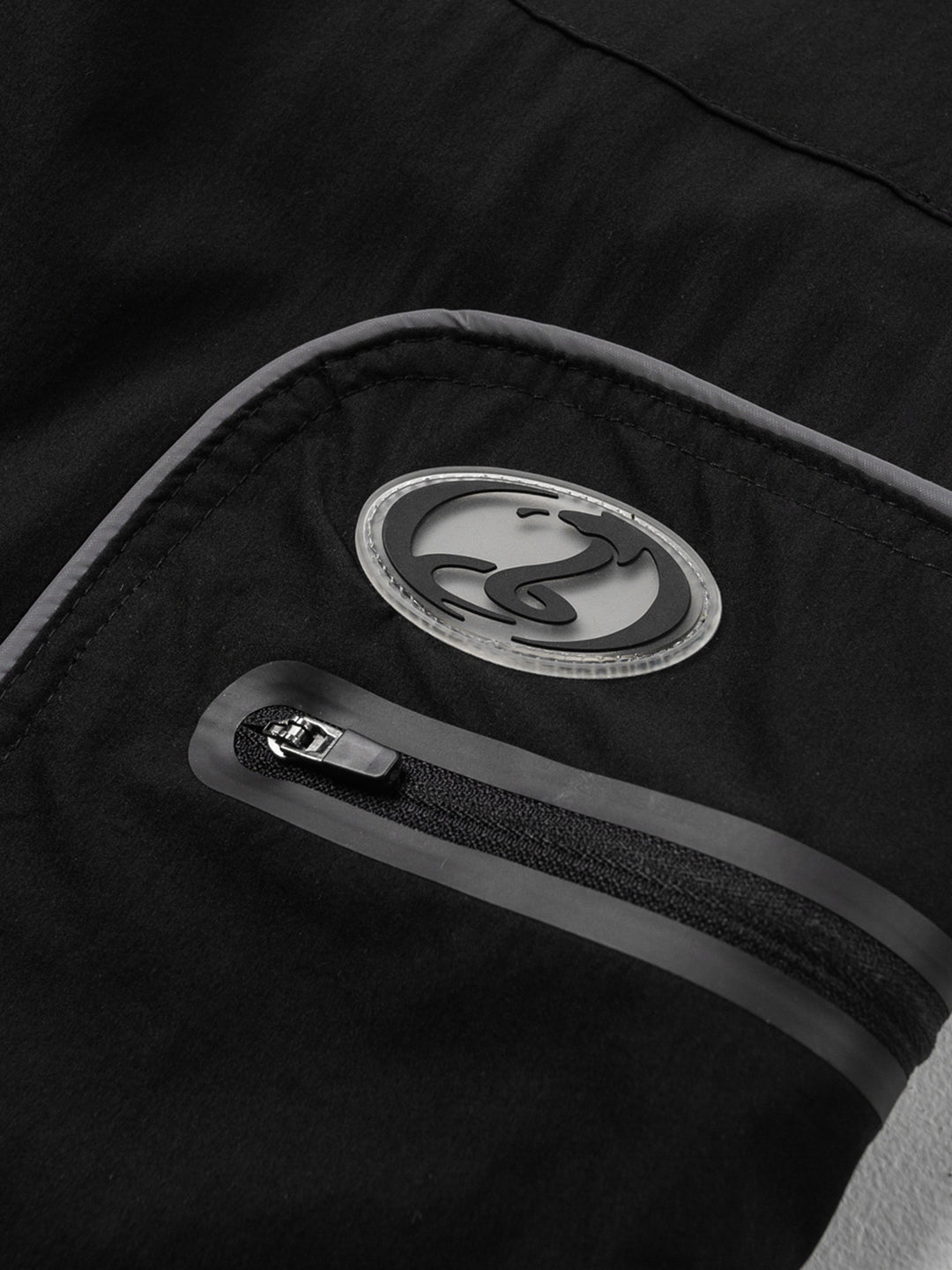 Water resistant mid-weight elastic waist wide leg cargo pants with 3M reflective piping, organic shaped cargo pockets, heat sealed zips, hem cinch cords, internal drawcords, YKK hardware, embroidered back pocket and branded rubber label.