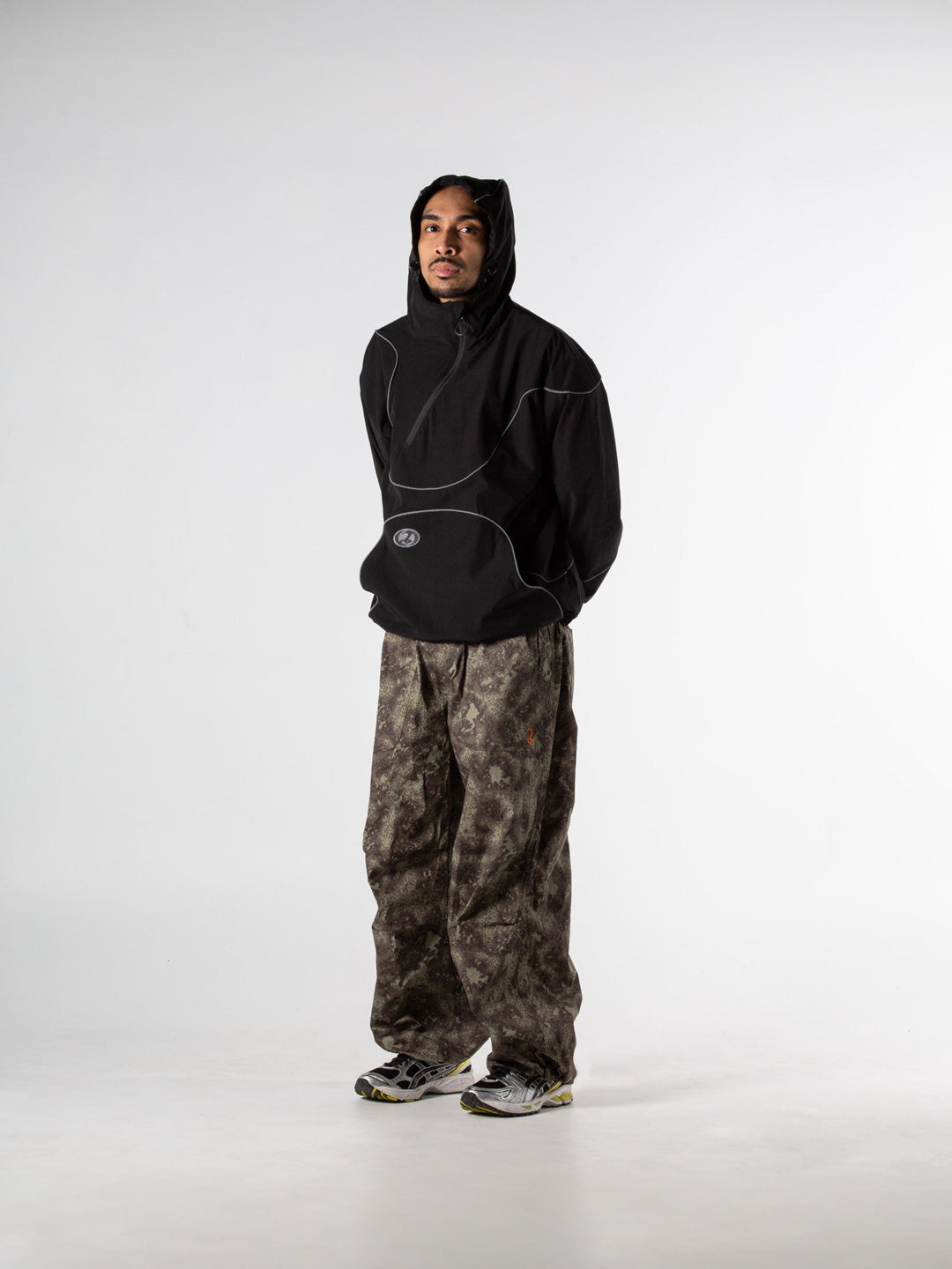 Water resistant lightweight 1/4 zip shell jacket constructed from nylon/ spandex – with internal mesh lining, contrast wavy panelling, 3M reflective piping, angled 1/4 zip, hood and hem cinch cords, joey pocket with internal zip closures, U-pull zip pulls, heavy duty YKK hardware and branded rubber label.