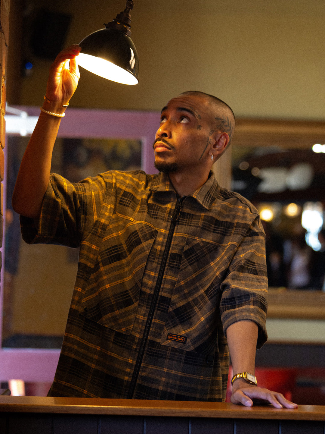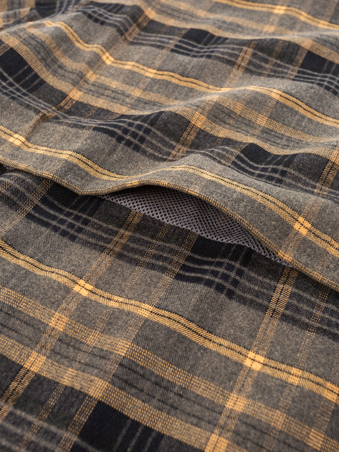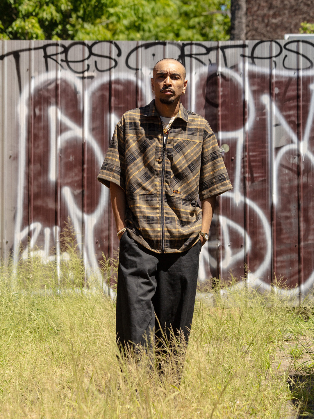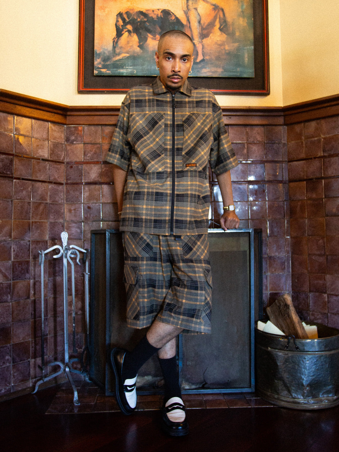 Relaxed, boxy fit unisex s/s shirt with dropped shoulder and traditional flat collar. Constructed from cotton plaid material featuring ammo pockets on front chest, back storm flap with underlay mesh ventilation, branded embroidery on chest and sleeve, metal pocket loop and YKK zip-thru closure with u-zip pull.