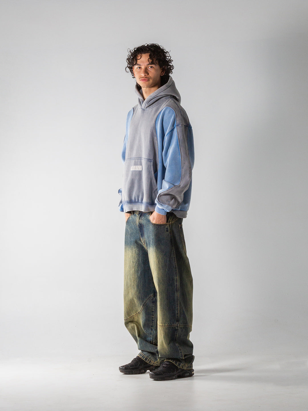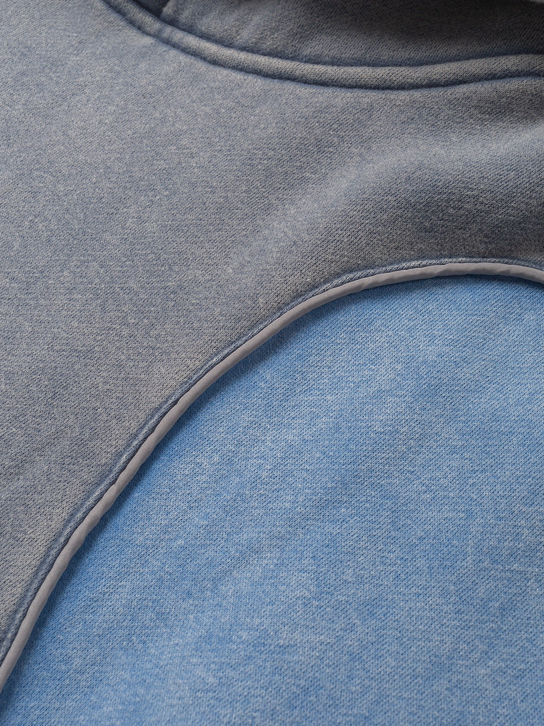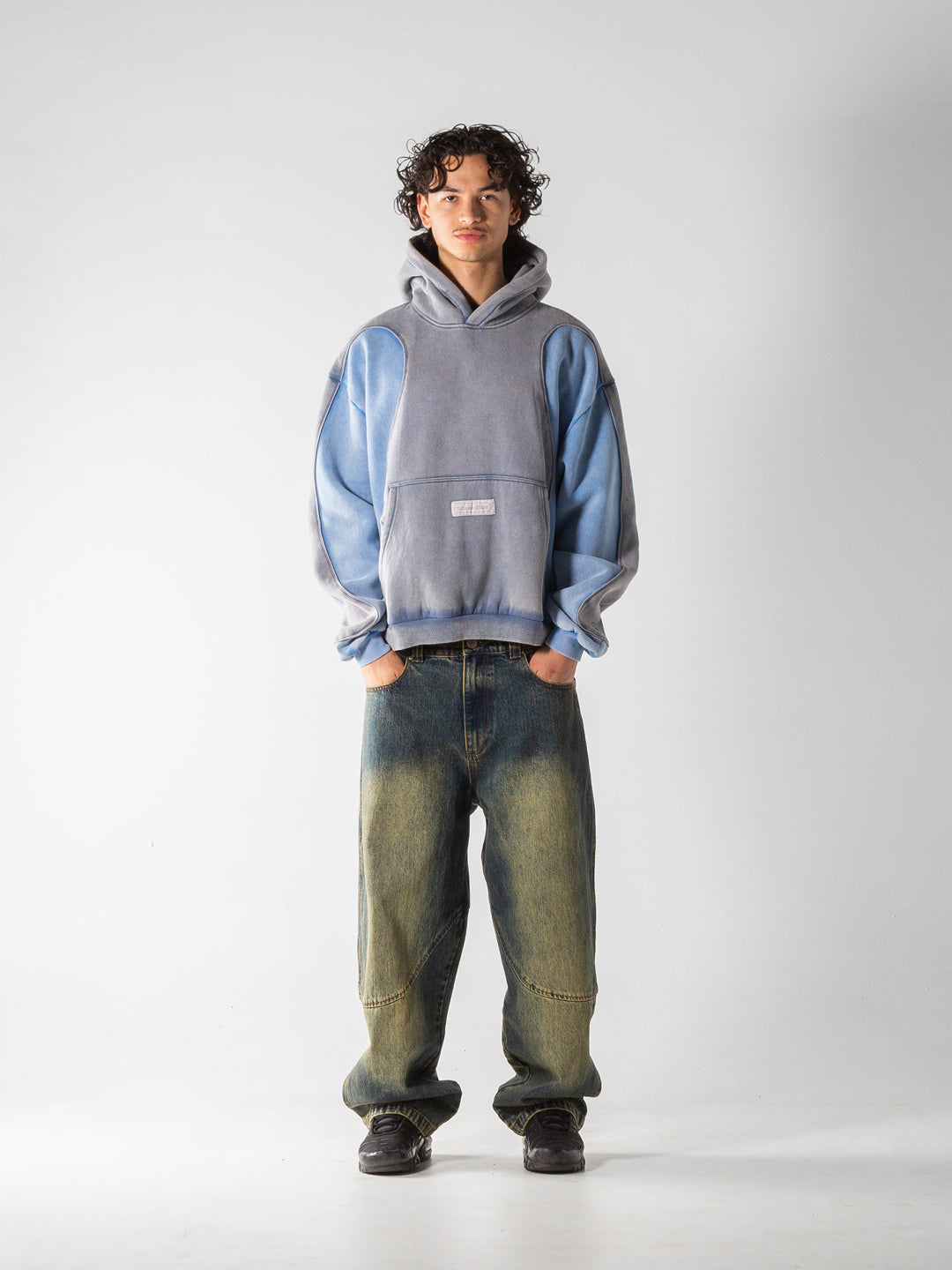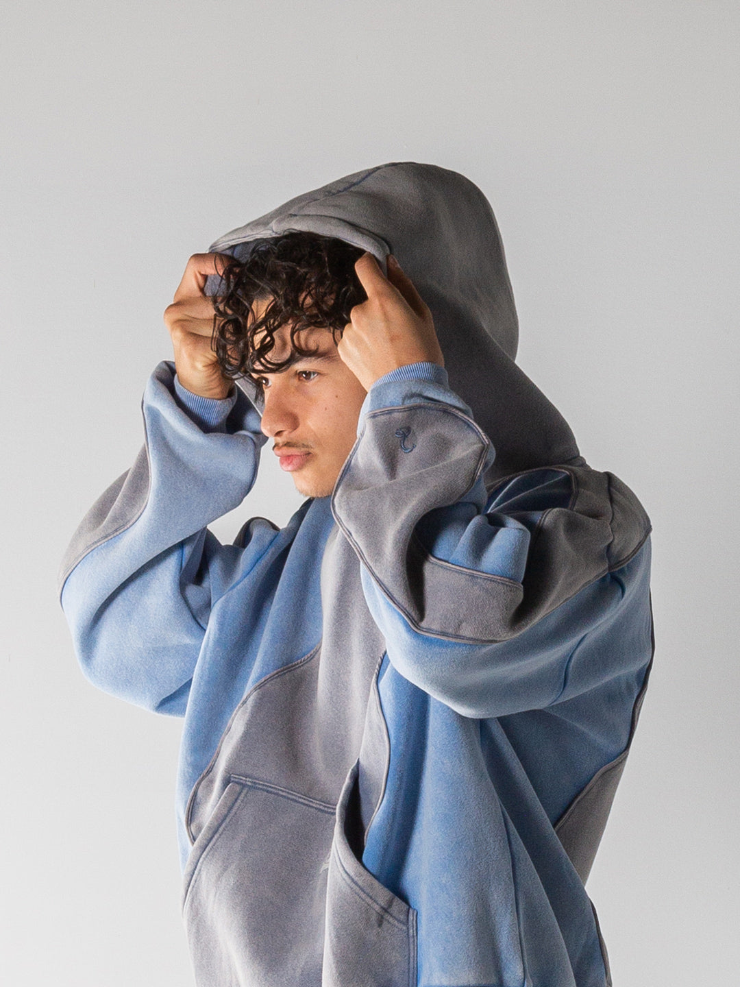 The Odyssey hood is made from our plush 360gsm heavyweight brushed fleece, featuring our unique tonal panelling with contrast piping and branded woven label. This piece has 90's flavour, with an exaggerated dropped shoulder giving the sleeves a baggy fit. The body has a slightly cropped, boxy shape for a relaxed fit. Finished with heavyweight 2x1 ribbing and large joey pocket on centre front.